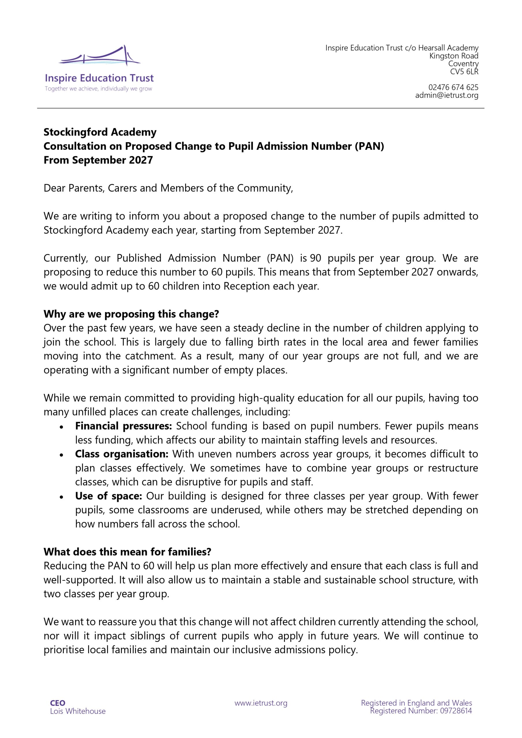 Stockingford Academy is consulting on reducing its Published Admission Number from 90 to 60 from September 2027. The consultation runs from Monday 3 November to Monday 15 December 2025. Click here to read the full letter and share your views.